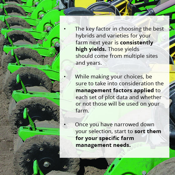 When sorting through plot data, make sure to look at the specifics about each plot. This includes the trait packages, planting and harvest date, grain moistures, previous crop, planting and harvesting populations, irrigation, tillage types, fertilizer rates, soil types, herbicides, fungicides, insecticides, and any other notes you may find on the plot results reports.