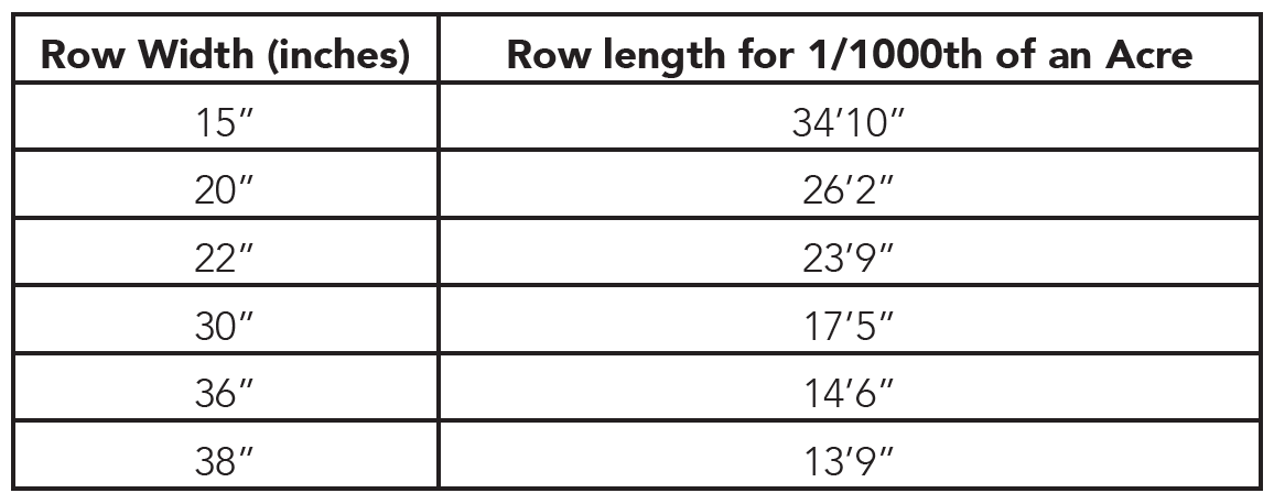 Table 1. Common row widths and the distance needed for 1/1000th of an Acre