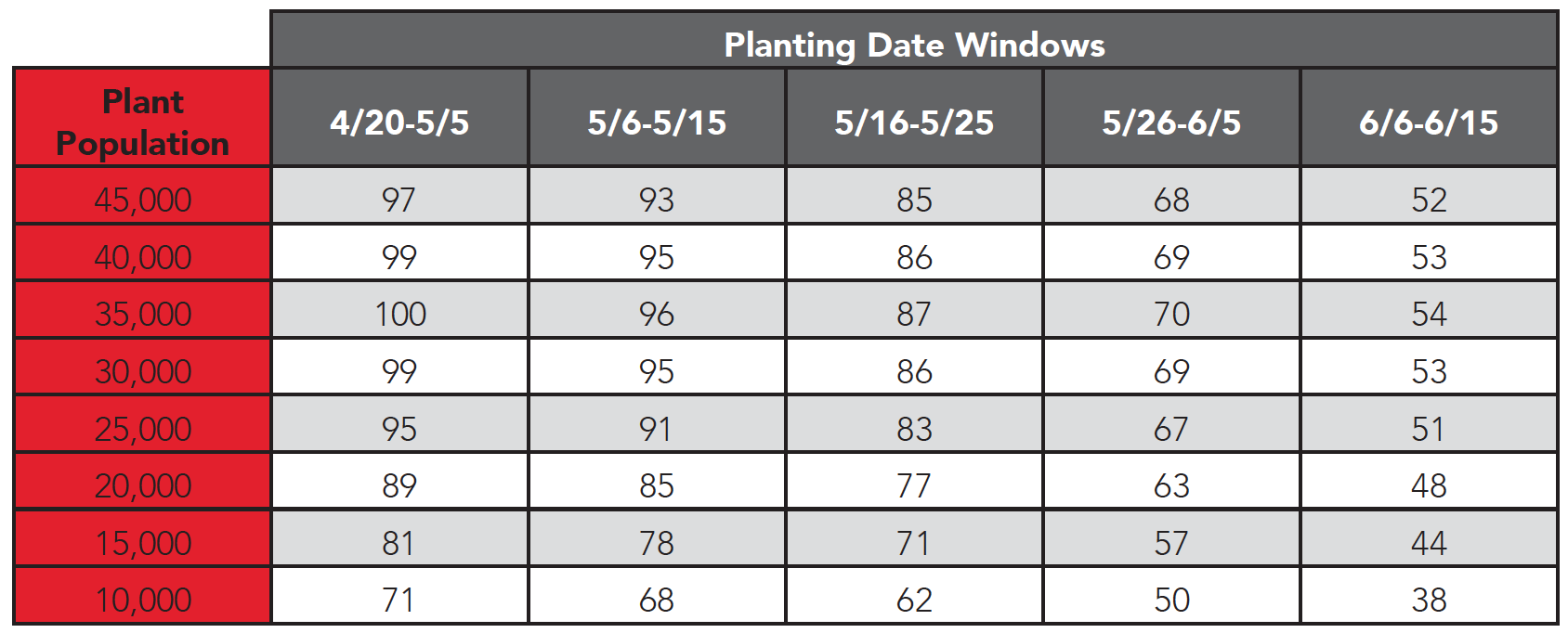 Table 2. Percentage of maximum yield potential for various planting dates and populations