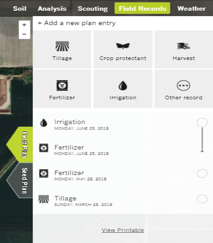 Just click on the desired operation, fill in the blanks, and have your plan put into motion by viewing it in Field Records or the popular Timeline that incorporates temperature, precipitation, crop growth stage, and growing degree days.
