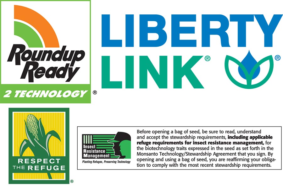 Acceleron and Design®, DroughtGard®, Genuity Design®, Genuity Icons, Roundup®, Roundup Ready 2 Yield®, Roundup Ready®, Roundup Ready 2 Technology and Design®, Roundup Ready 2 Xtend™, RIB Complete and Design®, RIB Complete®, SmartStax and Design®, SmartStax®, SR Design® , VT Double PRO® and VT Triple PRO® are trademarks of Monsanto Technology LLC. LibertyLink® and the Water Droplet Design® is a registered trademark of Bayer. Herculex® is a registered trademark of Dow AgroSciences LLC. Respect the Refuge and Corn Design® and Respect the Refuge® are registered trademarks of National Corn Growers Association. All other trademarks are the property of their respective owners.