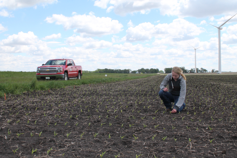 After my time learning about Phythium, Kally and I headed west to visit test plots. We visited three different plots, traveling nearly to the South Dakota border. While at the plots we took stand counts, soil samples and looked for inconsistencies across varieties of corn. I was impressed with Kally’s agronomy knowledge and listened to her carefully to learn as much as I could. However, for me, the best part was being able to snap some photos of Kally getting her hands dirty in the field with her bright red truck in the background. The marketer in me must have been showing!