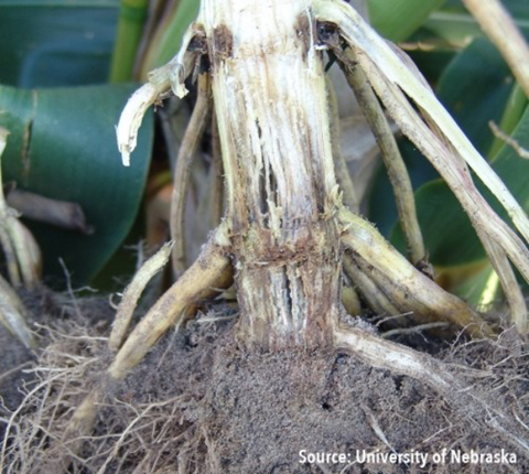 46ddad1fed2e4b42ac27d78093265af9Cold rains early in the growing season can cause crown rot (pictured) to be visible in many fields. This rot stops the flow of nutrients to the rest of the plant and can lead to weakened stalks and significant losses in yield. In addition, Physoderma brown spot popped up after heavy rains in the middle of the growing season, around June and July; Physoderma can lead to standability issues, but still can result in decent yields.