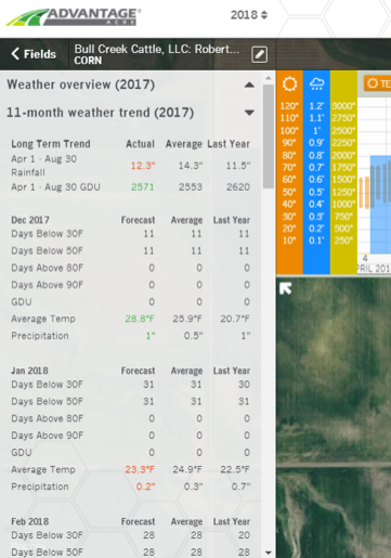 This data set is complex and large, but Advantage Acre collects it all for each individual field, and makes it much easier to interpret. After a field is selected, simply click on the Weather tab at the top to pull the weather pane up on the left side of the screen. With a free account, a grower can see the Weather Overview and the four-week forecast. The Weather overview is a compilation of the past year’s weather, segmented out into different time ranges for precipitation, temperature, and Growing Degree Units. The four-week forecast is a summary by week for the upcoming month for those three categories, as well.