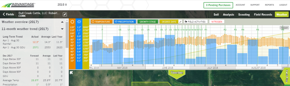 All of this data is also displayed within the Timeline at the top of the page. Temperature is displayed per individual day throughout the 11-months as well as in the past. Precipitation is displayed as daily as well, up until two weeks in the future, and from there it is displayed as a weekly total. This data is then complied to predict the GDUs accumulated since planting which also allows Advantage Acre to predict each growth stage through maturity. The user can then get an idea for what the weather will be like at critical stages of the crop’s life. In the future, we will discuss the Timeline further.